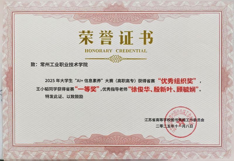 近日,由教育部高等学校图书情报工作指导委员会指导,江苏省高职高专图工委主办的2025年江苏省大学生“AI+信息素养”大赛(高职高专赛道)圆满落幕。